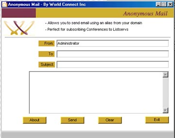 AnonymousMail™ Overview Anonymous Mail is a RAD utility for email administrator's which allows you to send an email from any alias or account from your domain. Price $99 per copy licensed on one server. Demo Available on World Connect's